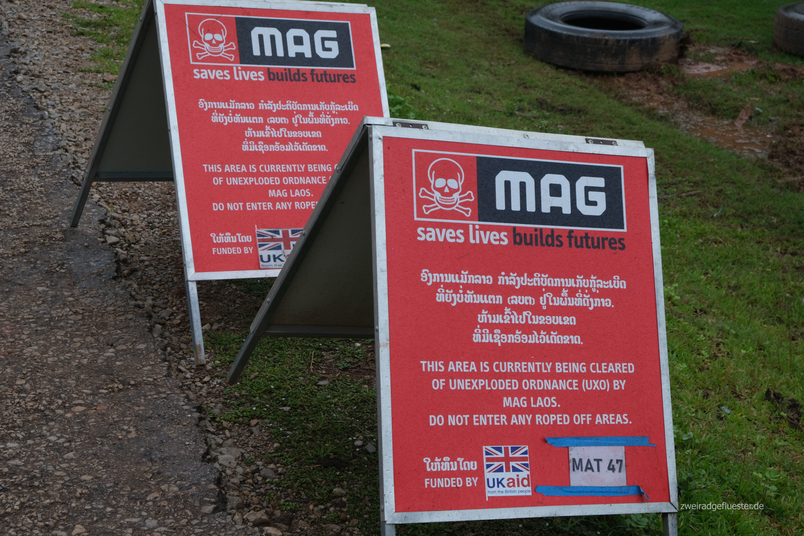 Immer wieder sehen wir kleine Teams der internationalen Räumorganisationen, die in müßiger, gefährlicher und nicht enden wollender Arbeit den Boden dekontaminieren. Wir befinden uns wieder auf dem sogenannten Ho-Chi-Minh-Pfad, der strategischen Versorgungsroute während des Indochinakrieges. Hier wurden einst Güter von Nord nach Süd transportiert, was wiederum zu den Bombardierungen durch die US-Fliegerstaffel beitrug. Kurz vor der Grenze befindet sich ein Knotenpunkt des Pfades, das Ausmaß der hier abgeworfenen Bomben ist ein Grauen.