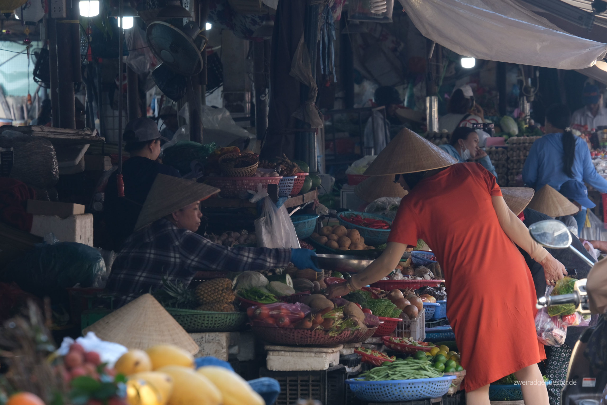 Am frühen Morgen treffen wir uns mit der sympathischen Hanh. Zu unserer Überraschung kommen allerdings keine weiteren Gäste, wie vorher angesagt, und so schlendern nur wir gemeinsam mit ihr über den Markt. Wir erfahren viel darüber, wie man die exotischen Früchte oder Kräuter richtig auswählt und für was man die einzelnen Zutaten benutzt.