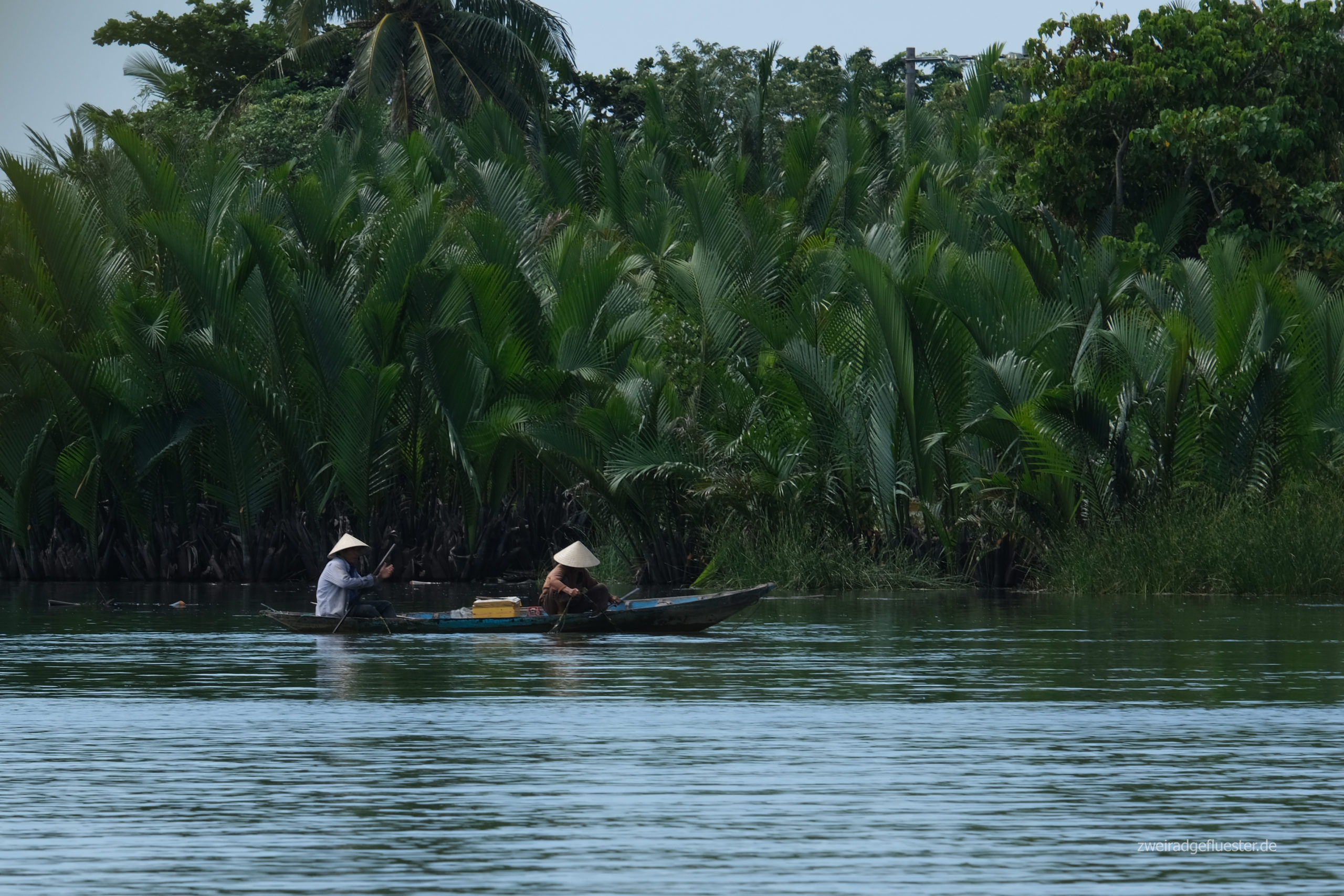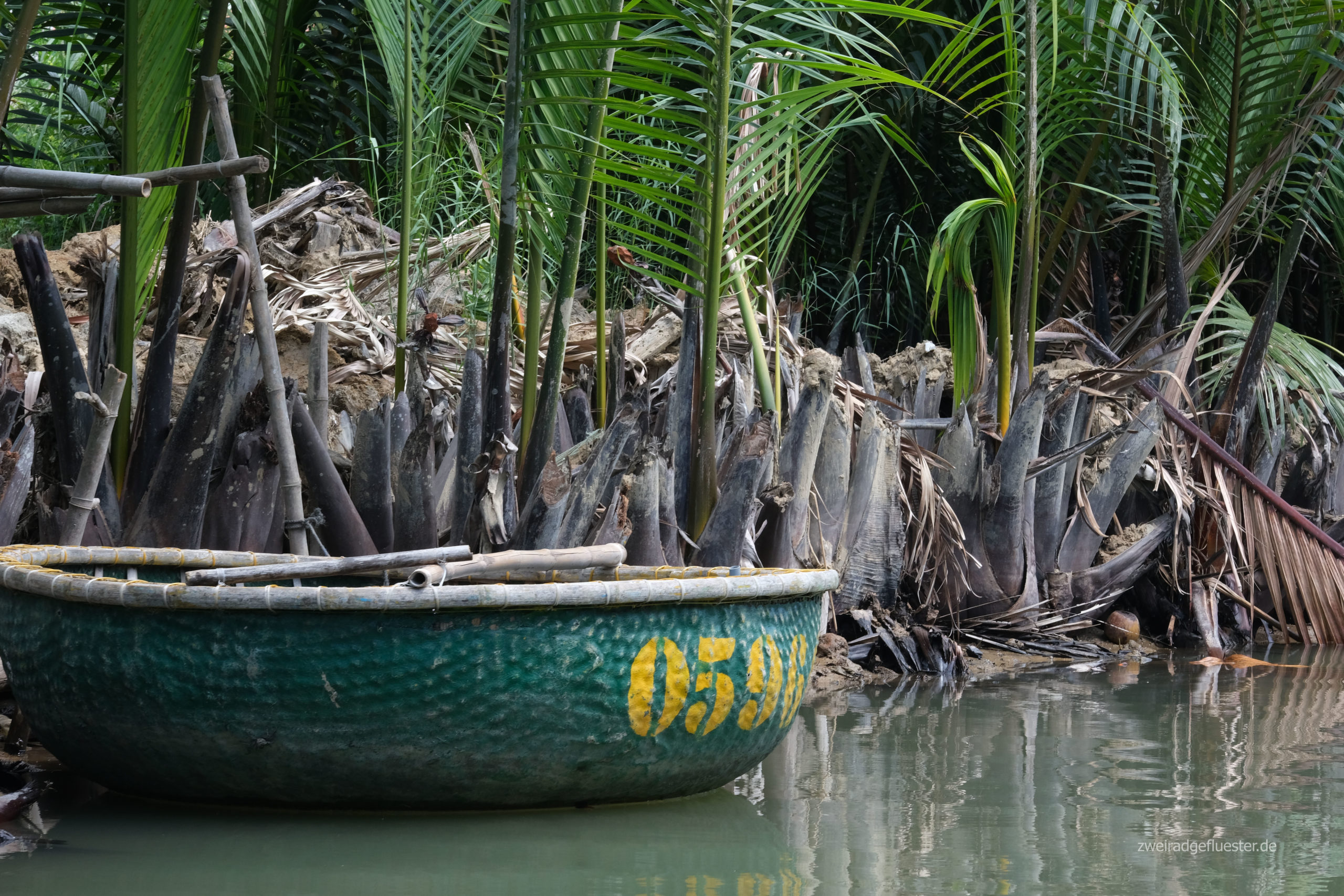Nachdem wir alle Zutaten für unser gemeinsames Kochen in den Beuteln haben, geht es für uns mit dem Boot auf dem Sông Thu Bồn Richtung Kokosnusswald, wo wir in ein kleines Bambusboot umsteigen und unsere ersten Krabben fischen. Doch keine Angst, selbstverständlich entlassen wir sie schnell wieder in die wohlverdiente Freiheit.