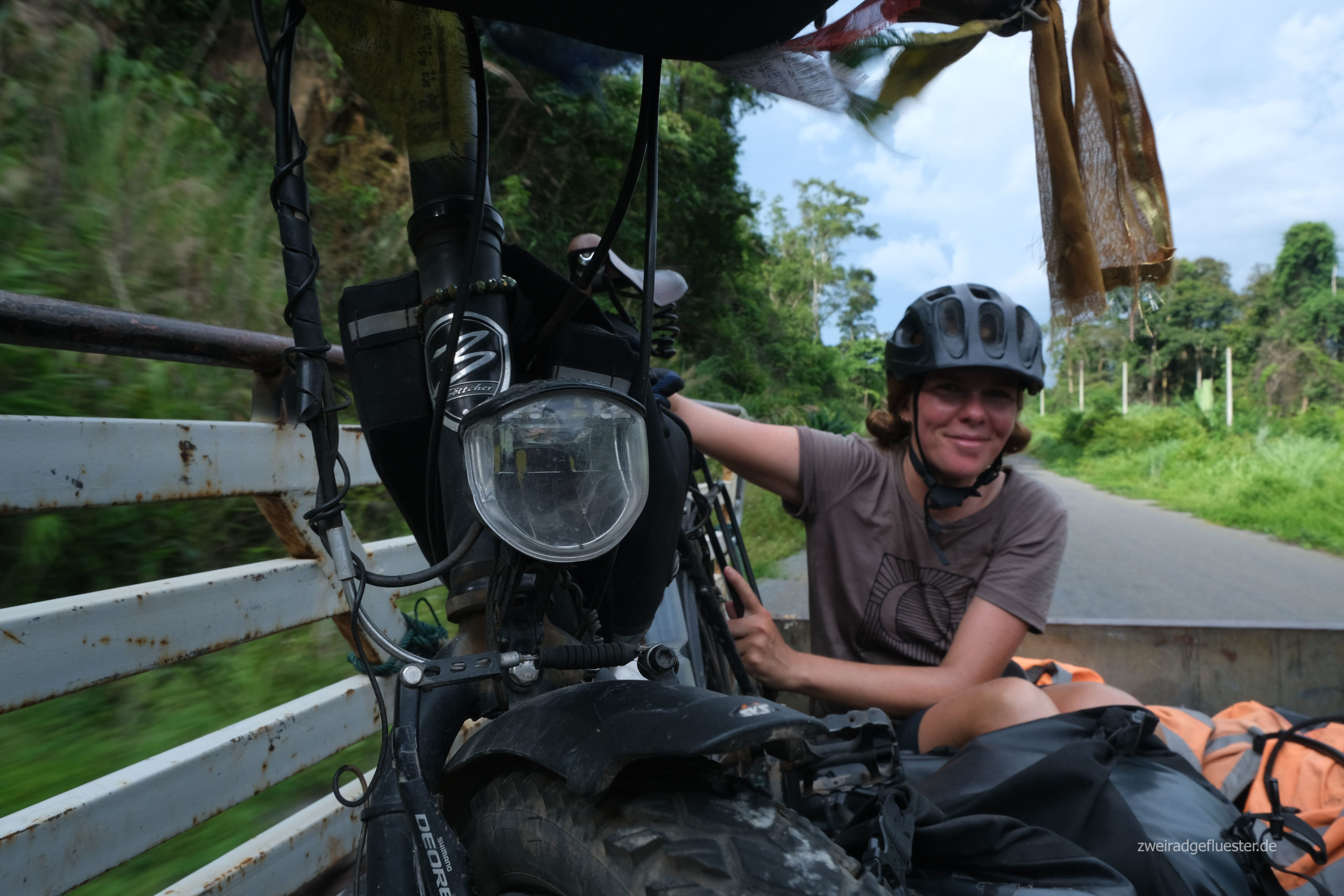 Als uns ein Kleintransporter überholt, winken wir ganz wild. Er hält an. Mit Händen und Füßen deuten wir auf die Ladefläche und irgendwann versteht der Mann, was wir wollen. Kurze Zeit später sitzen wir neben Schaufeln und Kies auf Zementsäcken und sind einfach nur froh, dass uns diese Bergetappe erspart bleibt.