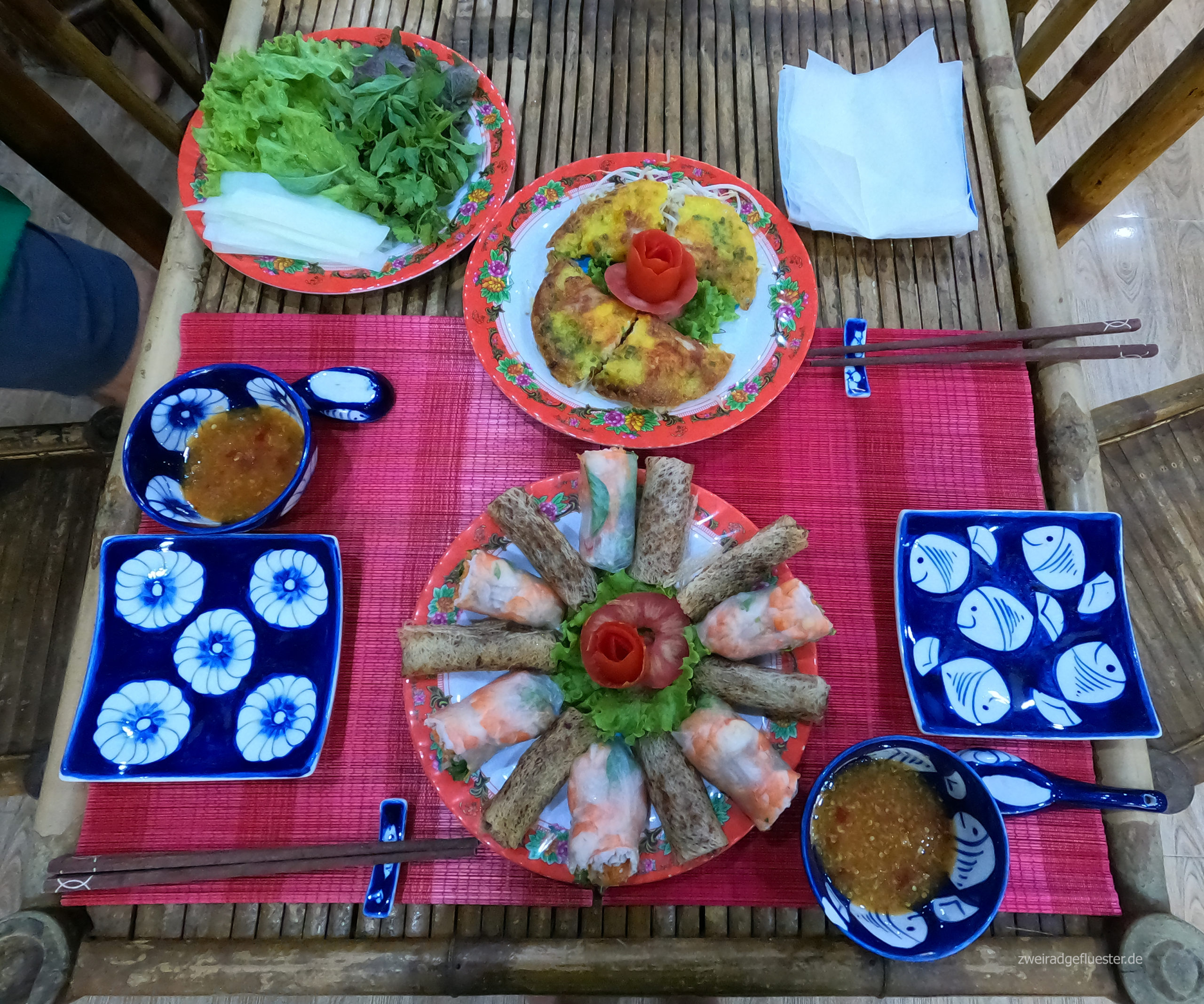 Später rollen wir die deftigen Pancakes mit den auf dem Tisch bereitgestellten Reisteigblättern und dem Gemüse sowie Kräutern ein, sodass eine Art Sommerrolle entsteht. Eine beliebte Art des Verzehrs in Vietnam mit Eigenaktivität und Geselligkeitswert.