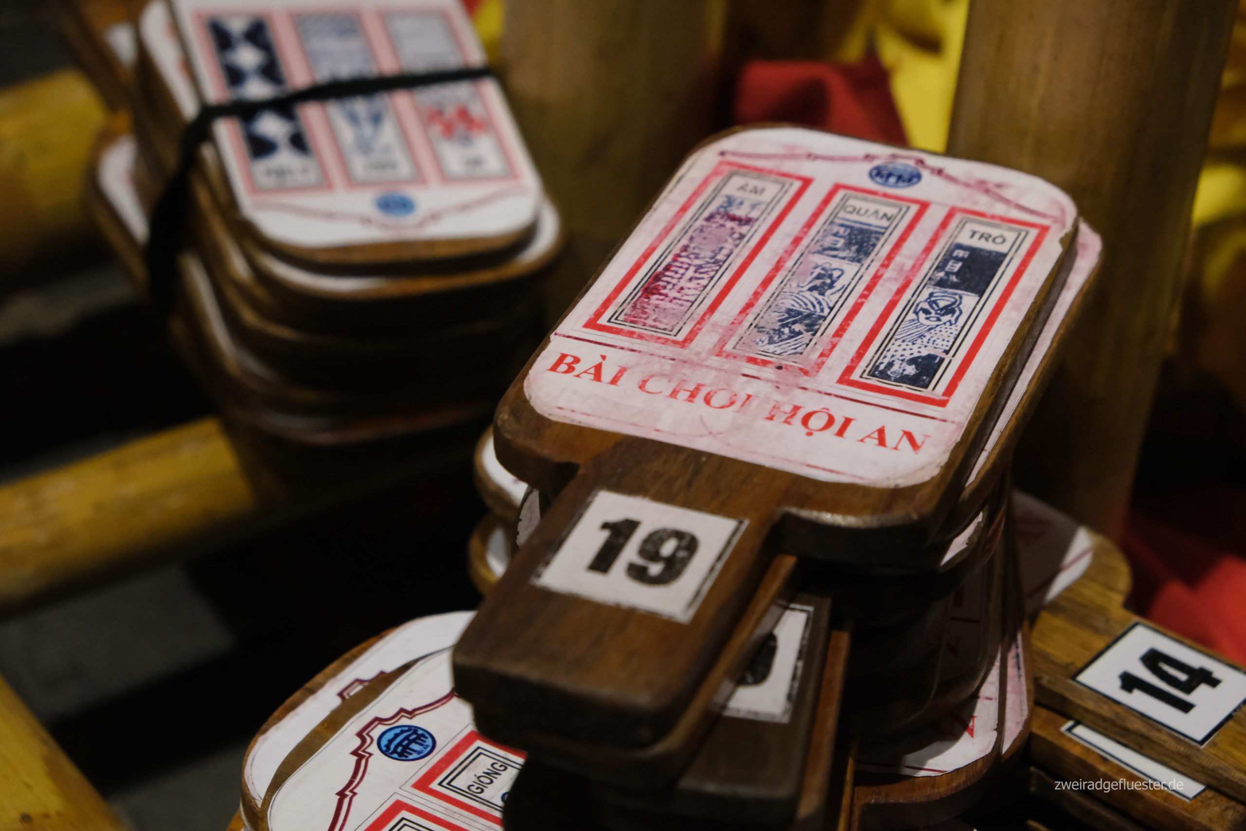Spaßig wird’s auch am Abend nochmal. Wir schlendern zufällig bei einem lautstarken Spektakel vorbei. Hier wird gerade Bai Choi in kleinen Bambushütten gespielt, eine Art Bingo mit Gesang und traditioneller Musik. Die Kunst des Bai Choi ist sogar im immateriellen Kulturerbe der UNESCO gelistet.