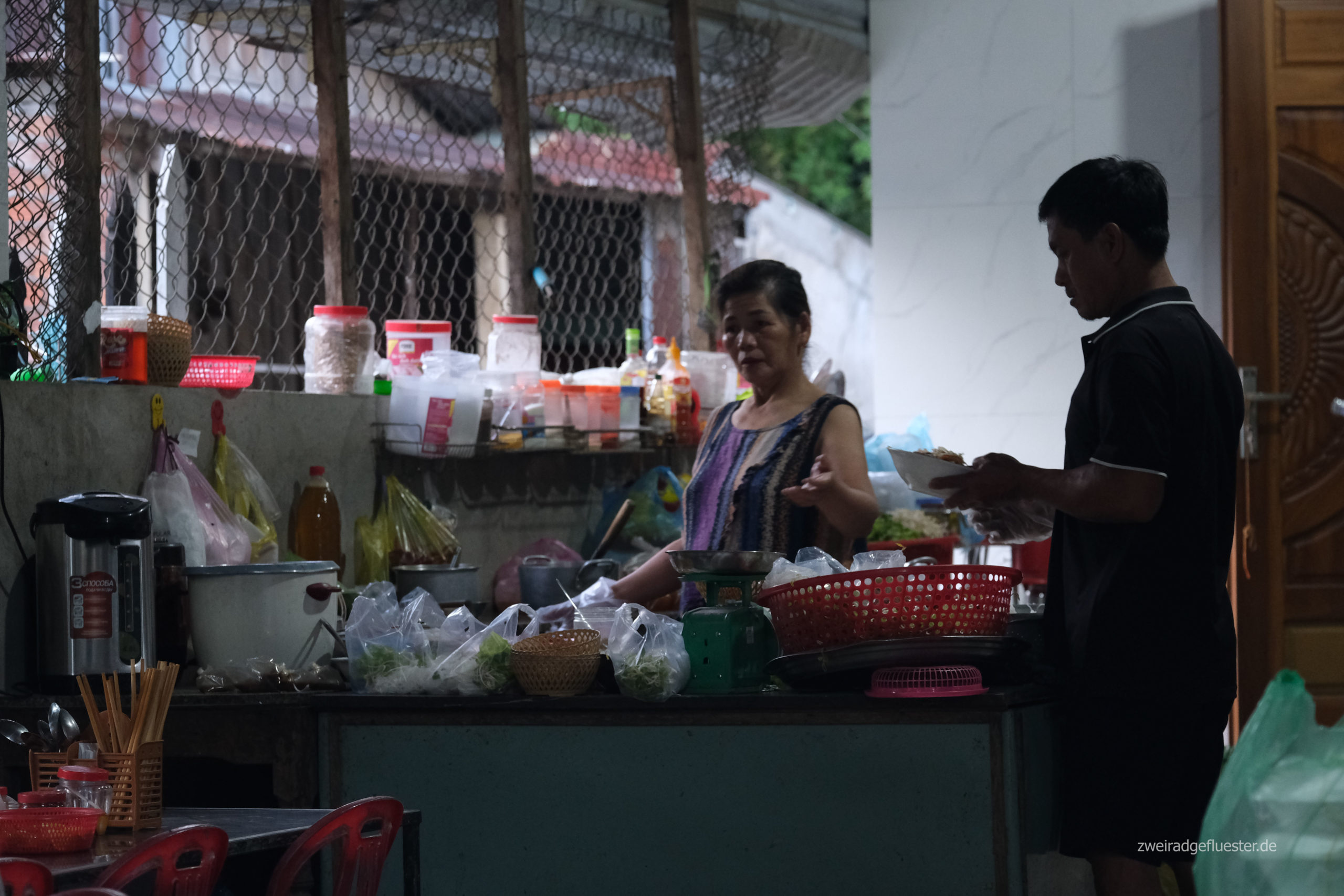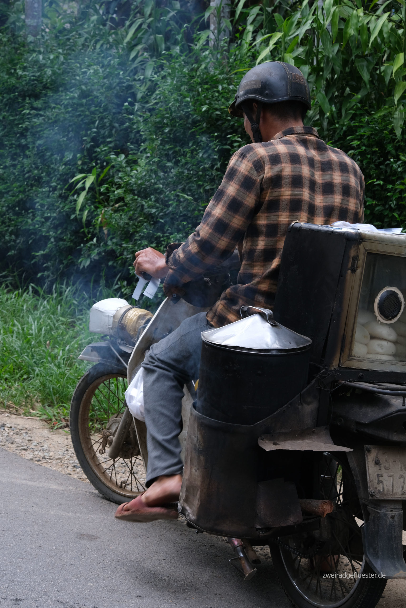 Der erste Stopp ist ein phở -Suppen-Stand, denn zumindest bei der traditionellen Nudelsuppe, die hier vor allem zum Frühstück verspeist wird, stehen die Chancen meist gut, nicht enttäuscht zu werden. Manche darauf spezialisierte Garküchen, haben deshalb auch nur morgens geöffnet und schließen im Laufe des Vormittags. Doch in etwas größeren Orten hat man auch am Abend Glück. Der knarzende Ventilator sorgt für etwas frische Luft. Die ältere Frau sitzt schon längst wieder auf einem Plastikstuhl in der kleinen Hütte aus Holz und starrt auf ihr lautstarkes Smartphone. Neben ihr der Kocher und ein großer Bottich mit benutztem Geschirr.