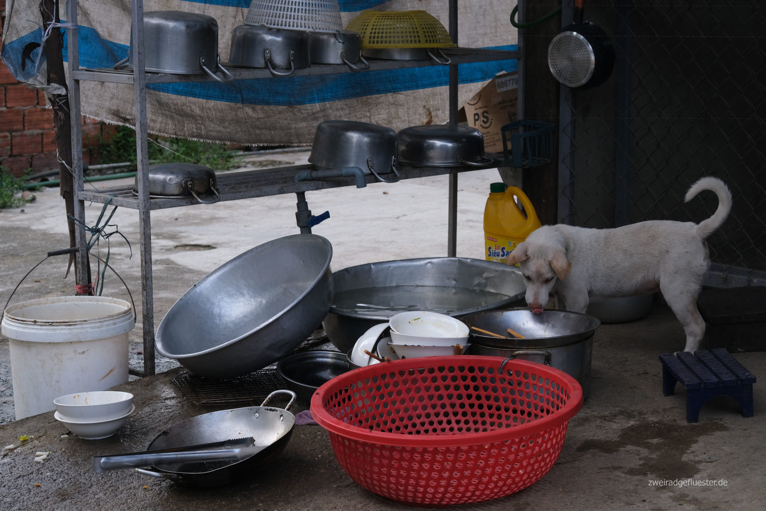 Die Töpfe liegen auf dem Boden verteilt. In einem großen Blechkessel stapelt sich das benutzte Geschirr. Fliegen schwirren überall herum und die Nagetiere verstecken sich wohl gerade nur vor uns. Auf der Kochstelle steht ein riesiger Bottich. Der Inhalt verbreitet einen unangenehmen, säuerlichen Geruch. Wasser gibt es aus einem großen Behälter. Wir schöpfen die warme Brühe mit einem Messbecher und lassen es über unsere Hände laufen. Im Wasser schwimmen irgendwelche weißen Fäden.