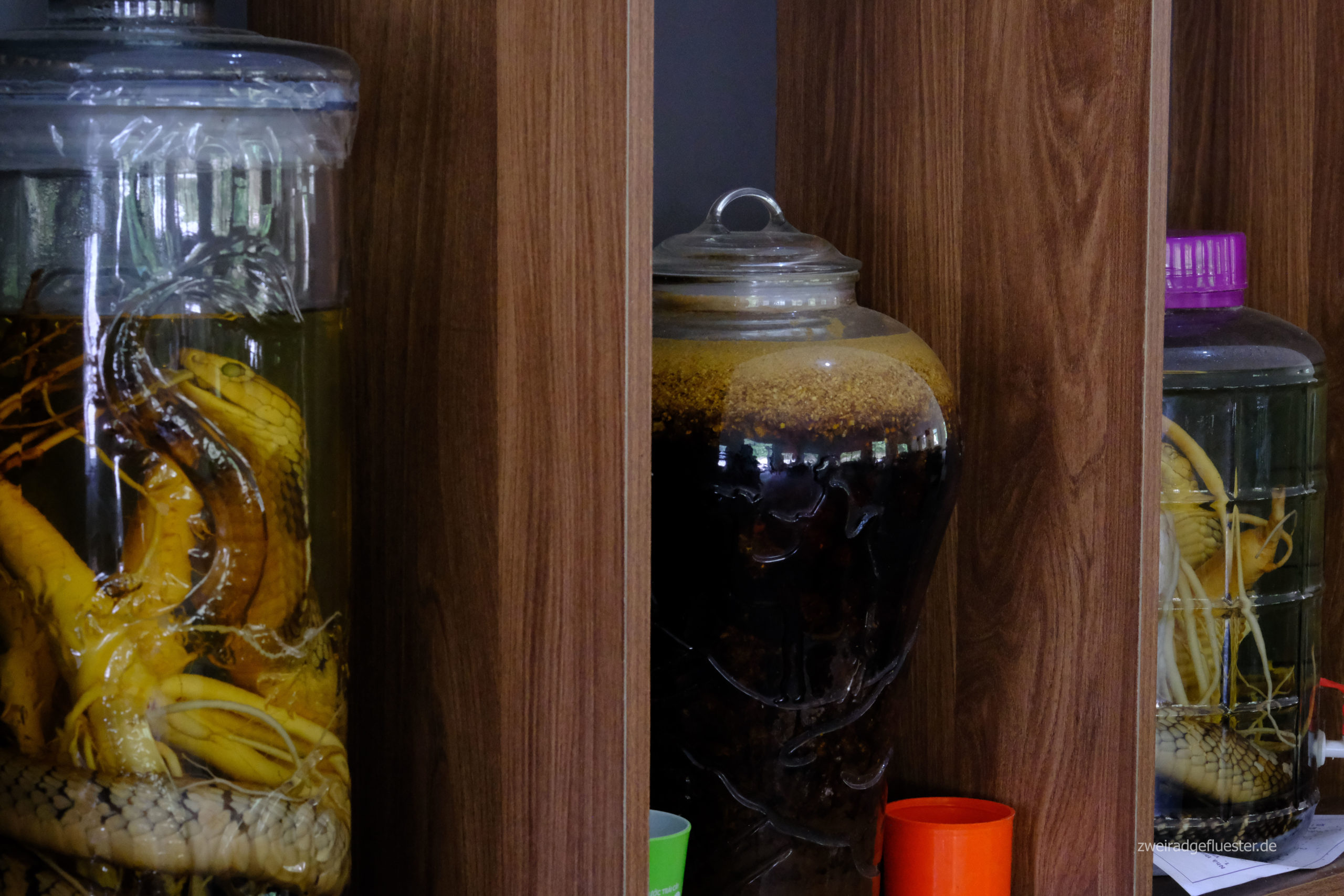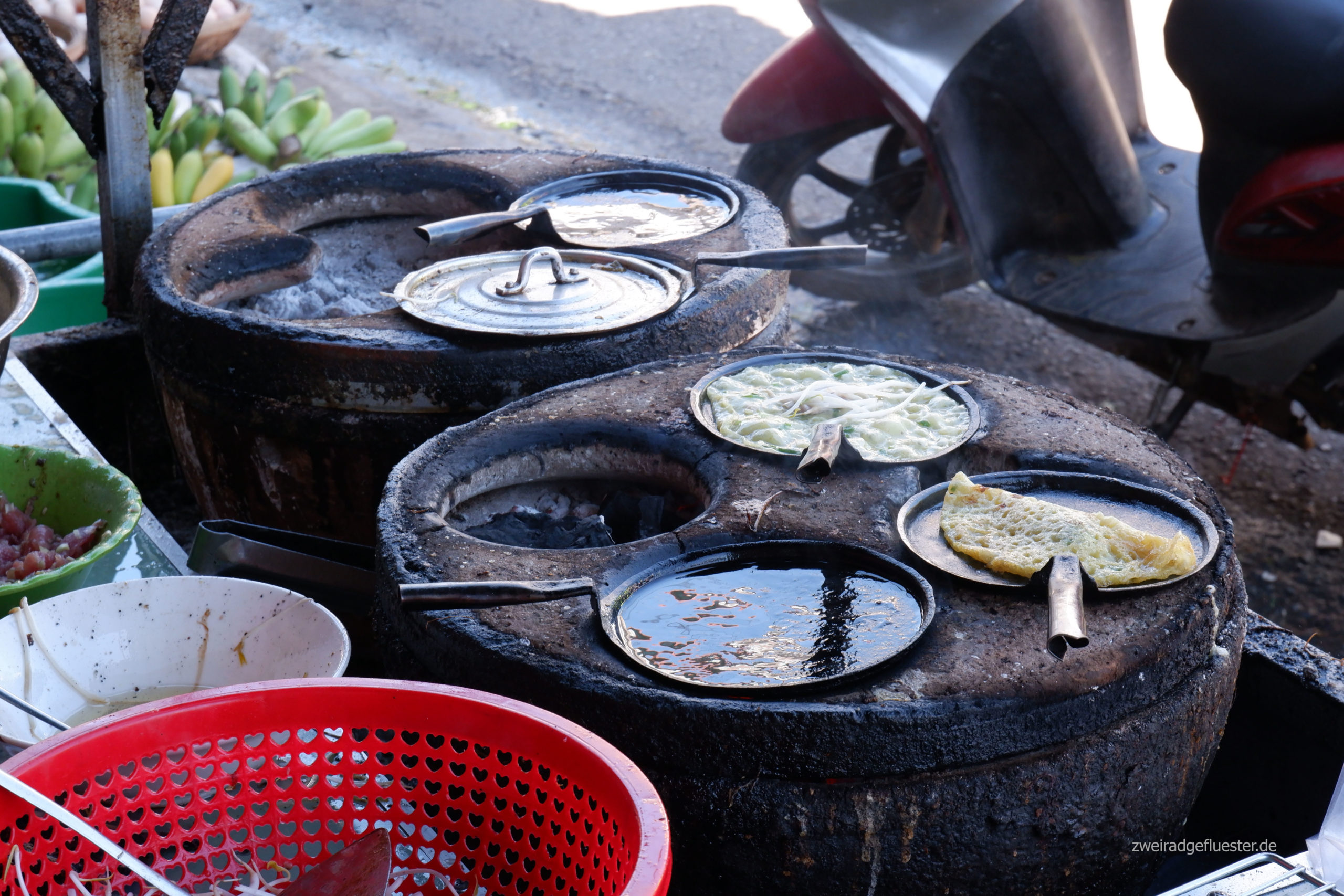 Wir halten an einem Marktstand mit Stühlen und Tischen. Nudeln, Reis, und Springrolls liegen auf einem folierten Styroporteller im Schatten der Mittagssonne. Auf der anderen Straßenseite Spieße mit gegrilltem Fisch und anderen Tieren. Ventilatoren vertreiben die Fliegen. Wie lange liegt das alles schon hier?