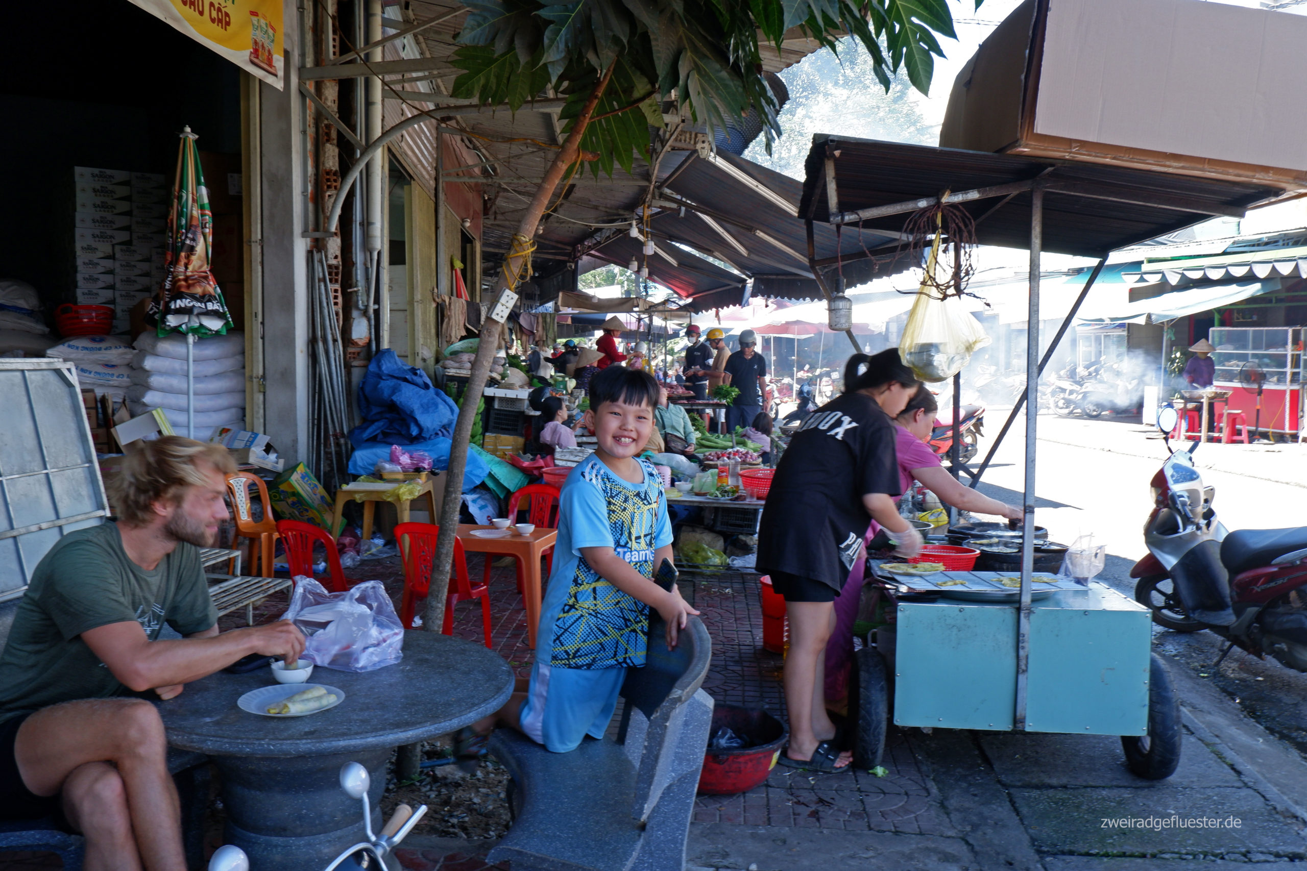 Am nächsten Morgen genießen wir ein letztes Mal einen vietnamesischen Markt. Bei unserem Frühstück an einem kleinen Bánh xèo-Stand werden wir herzlich von Chi unterhalten. Noch mehr, der Neunjährige verkörpert für uns zum Abschluss noch einmal unseren Eindruck der vietnamesischen Lebensart.