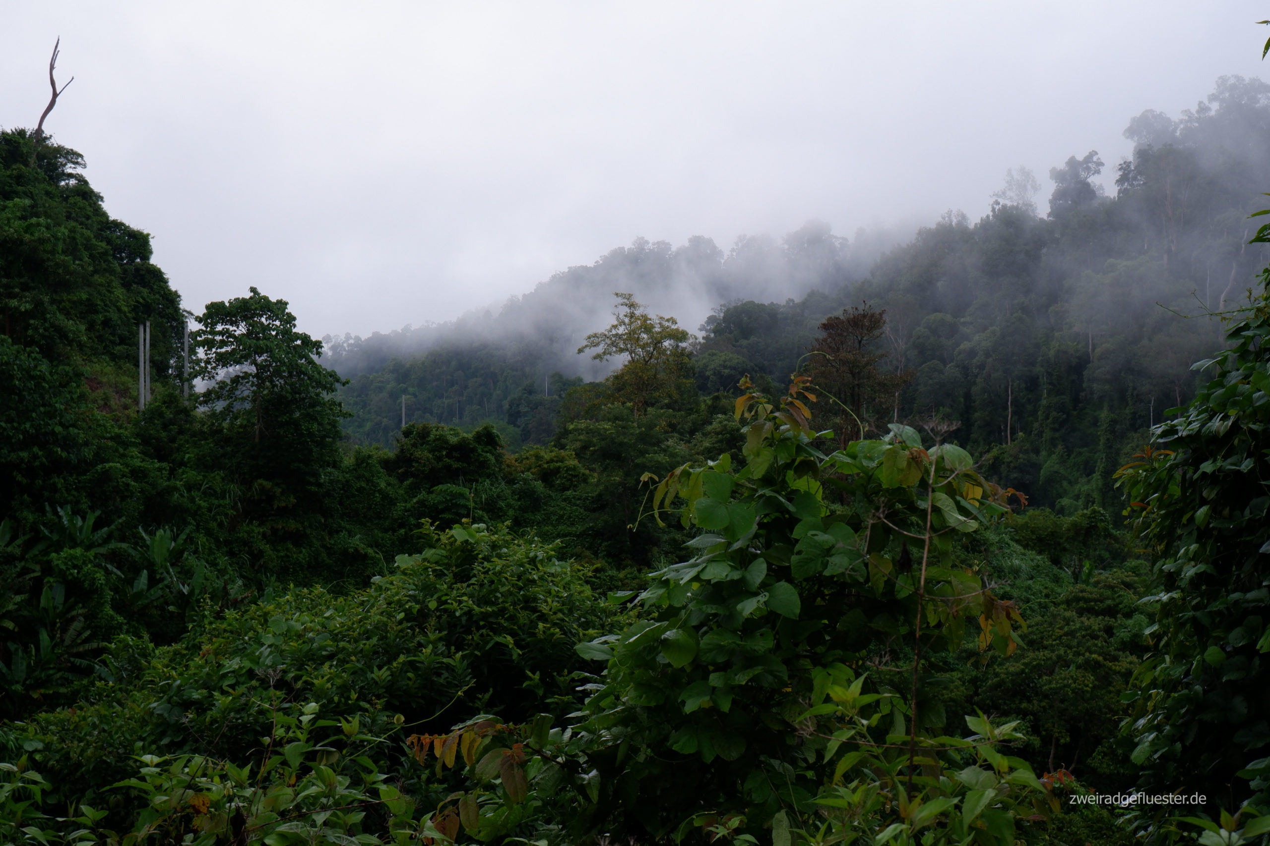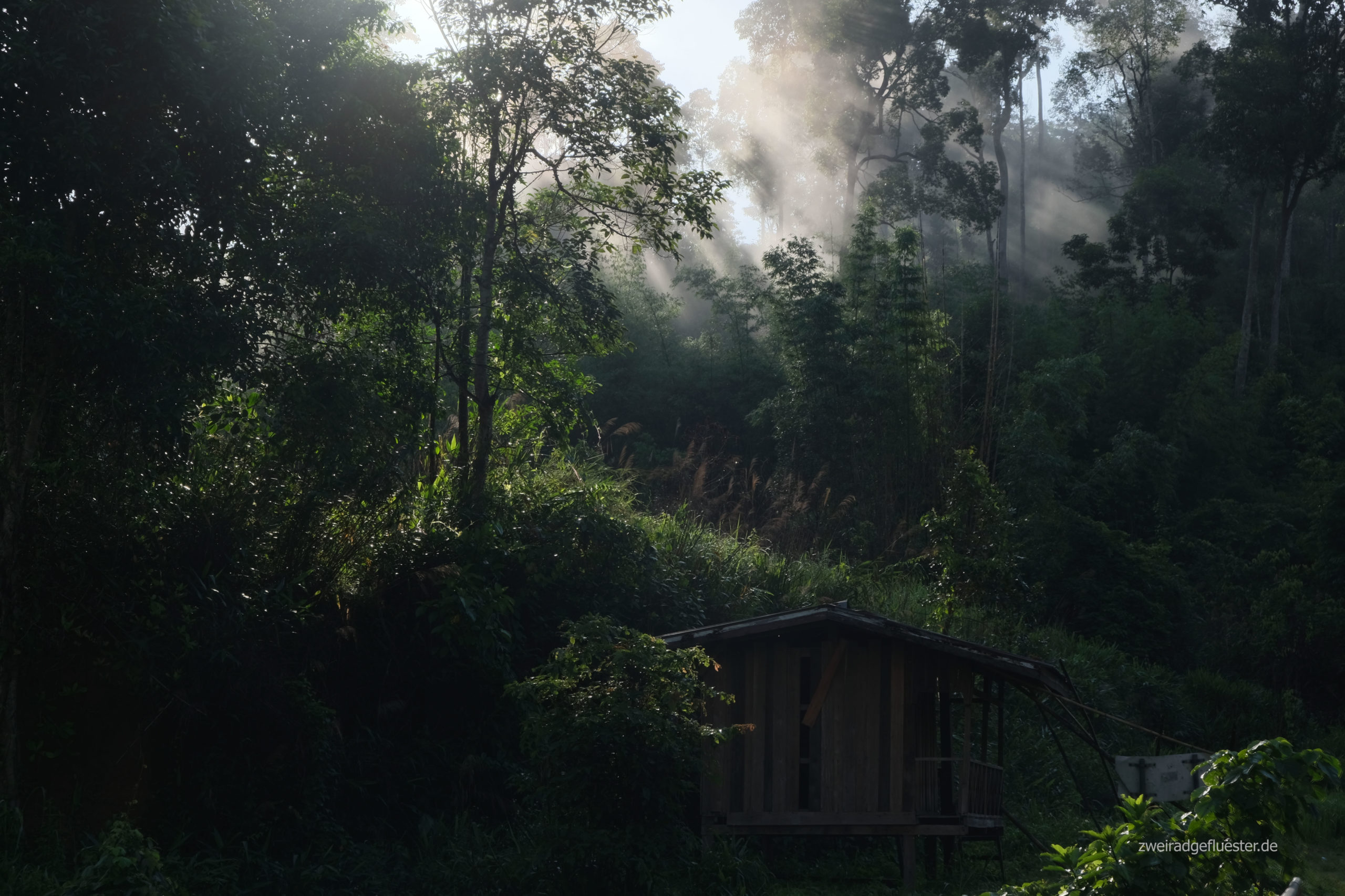 Wir lassen all die negativen Gedanken hinter uns und genießen die Natur. Der Regenwald scheint gerade zu erwachen. Wolken umhüllen die Bäume, es wirkt als dampft der ganze Wald! Die Sonne schiebt die ersten Strahlen durch die dichten Baumkronen. Wasser rauscht, Insekten zirpen, Vögel singen und wir hören sogar Affen kreischen.