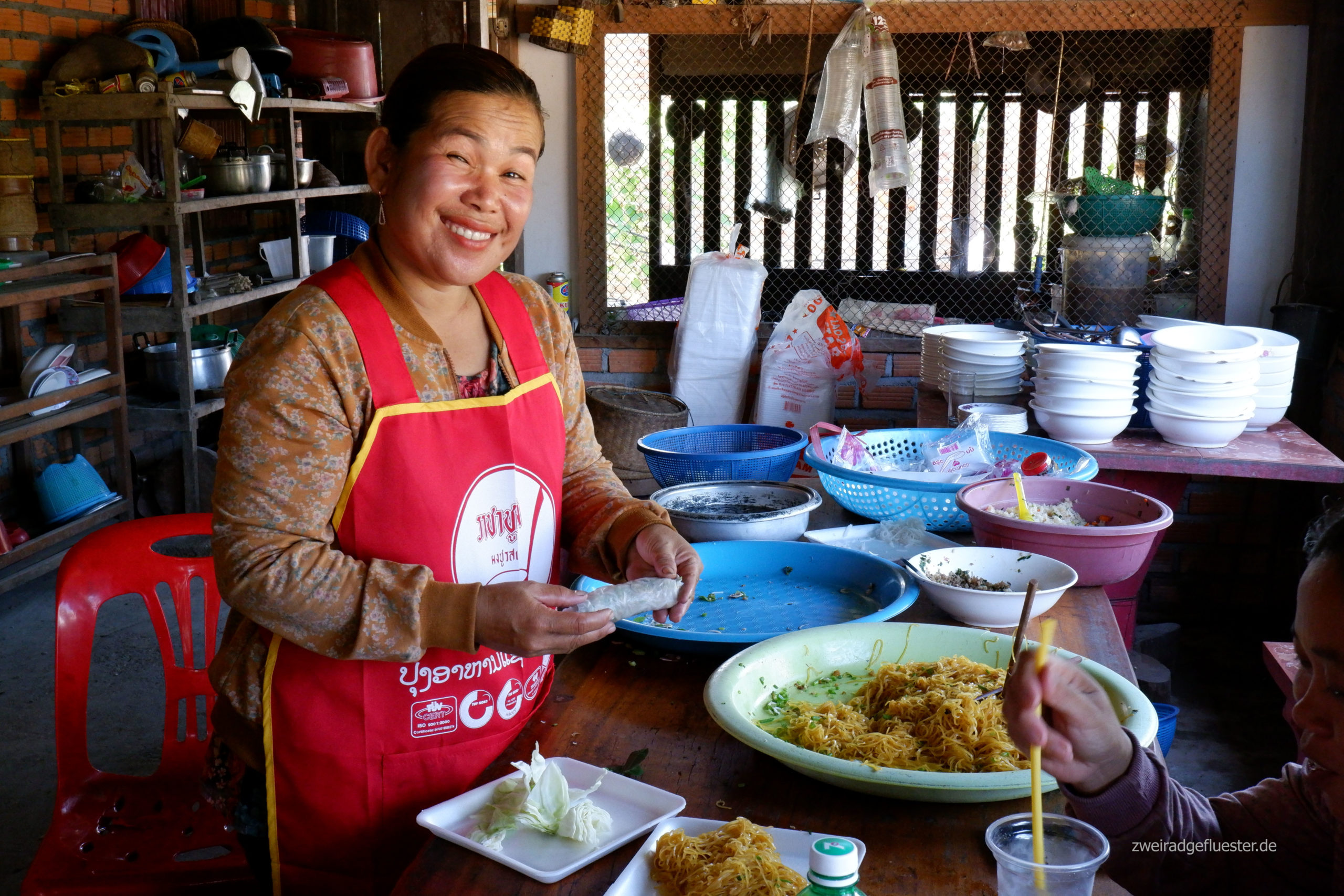 Wieder zurück auf der anderen Seite begeben wir uns nach Innen und sehen wie die lustige Frau gerade die Nudeln aus einer riesigen Schüssel auf den Styroportellern verteilt. Wir wagen uns an das Essen heran und es ist einfach nur köstlich! Wir nehmen direkt noch eine Portion!