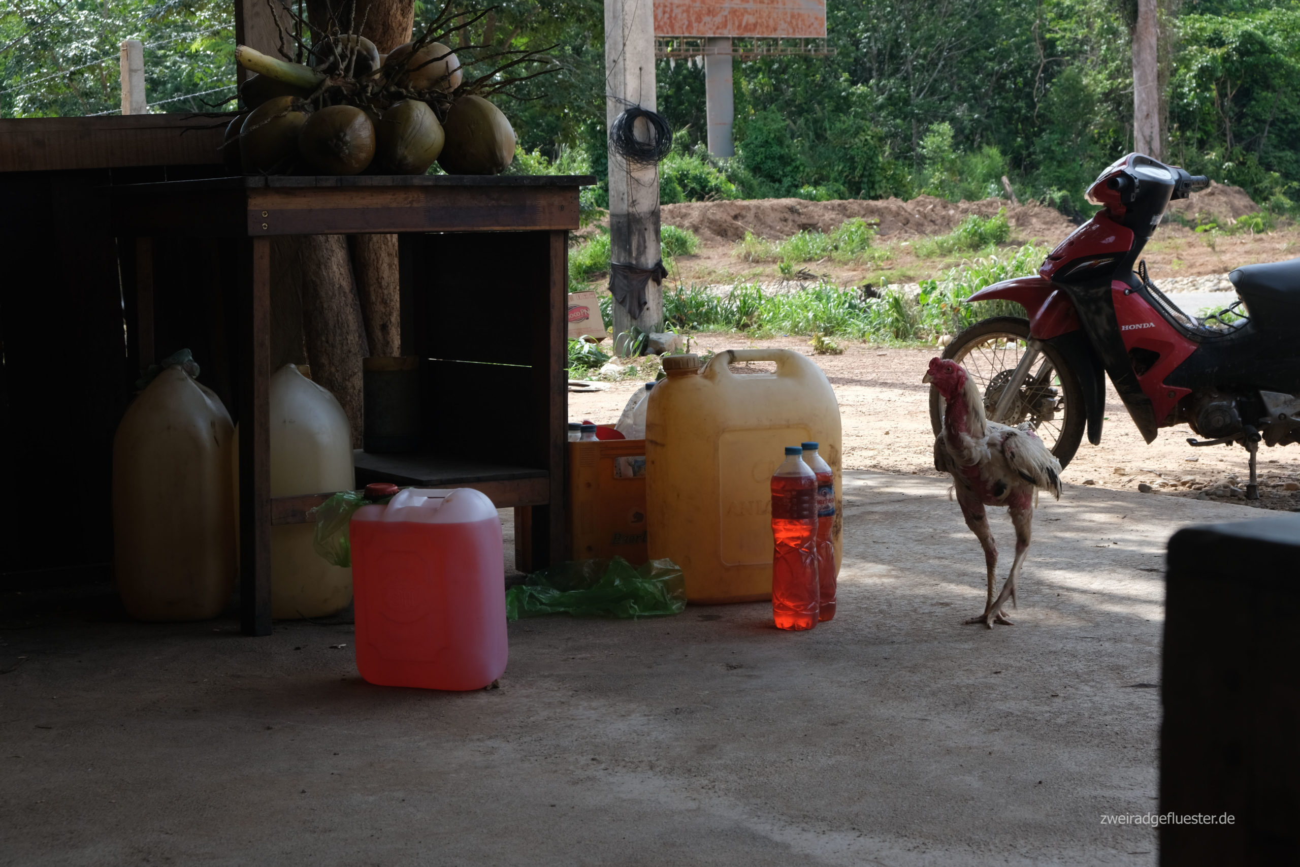 Eine Holzpalisade hinter diesem Schauspiel wird gerade ein Moped zusammengeschraubt. Den Mann haben wir zuvor schon auf der misslungenen Probefahrt gesehen. Während wir nun den Fruchtcocktail genießen, kommt ein anderer Mann auf dem Moped angesaust. An seinem Gürtel ist, wie so oft, eine Machete befestigt. Auf der anderen Seite steckt ein kleiner Ventilator im Hosenbund. Nachdem er eine Weile dasteht, deutet die Frau an, er solle sich schon mal selbst bedienen. Er holt zwei Plastikfaschen aus seinem Moped und befüllt sie mit Benzin. Der Plastikkanister steht direkt neben der Schubkarre mit den frischen Kokosnüssen. Nun tritt ein Hahn dem Geschehen bei und zieht unsere ihm folgenden Blicke mit sich. Er wühlt sich durch die Kokosnussschalen. All das ist einfach so alltäglich für uns geworden.