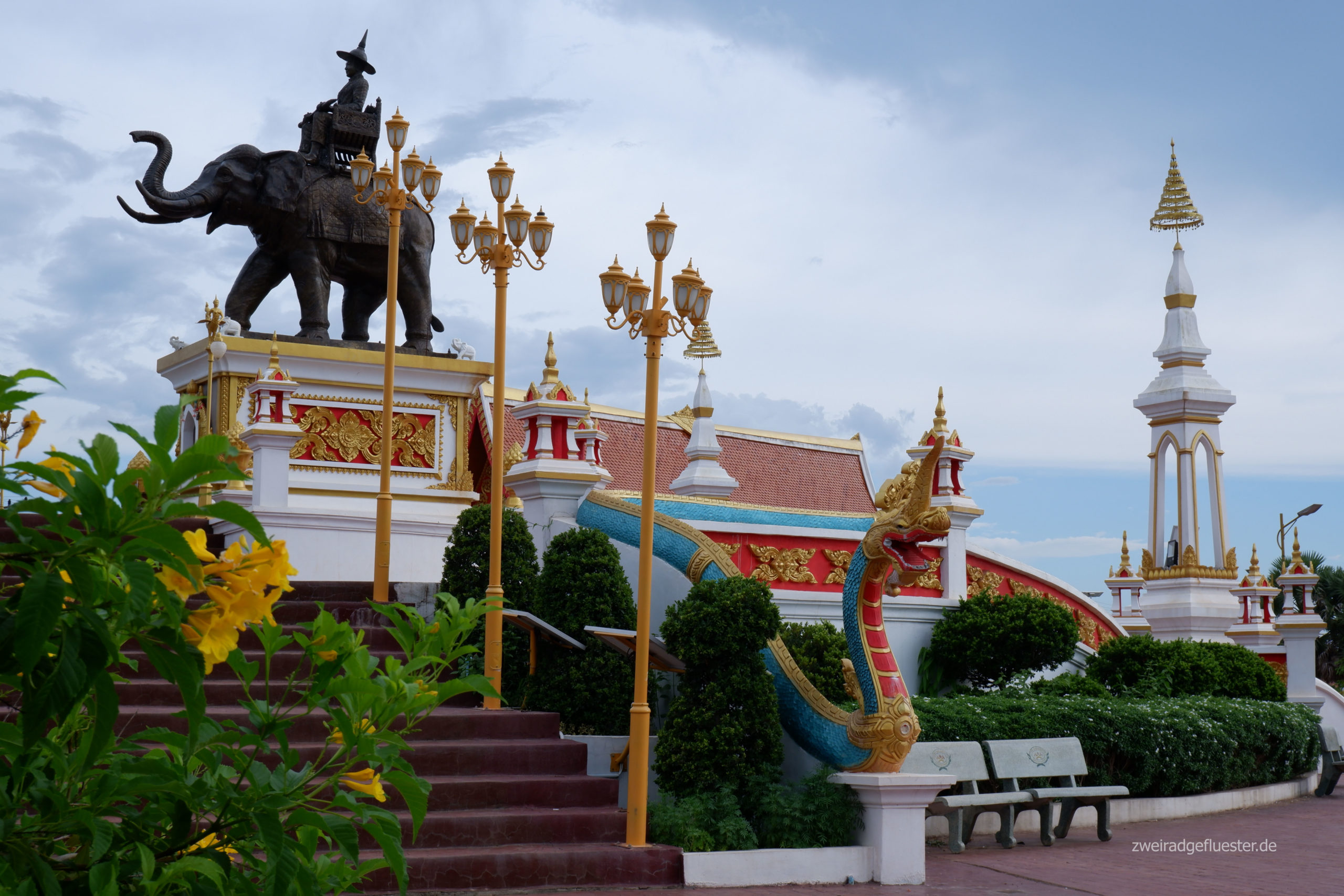 Wir rollen zu den gewohnt monumentalen Grenzgebäuden. Zwei Stempel später sind wir auch schon wieder in Laos. Wieder geht alles reibungslos. Der Grenzbeamte auf der vietnamesischen Seite fragt uns lediglich, nachdem er den Stempel bereits in den Pass gedrückt hat und die Pässe noch in seiner Hand hält, nach 50.000 Dong (ca. 2 €). Wir fragen wozu und er antwortet: „Für den Kaffee.“ Darauf erwidern wir lächelnd, wir wollen keinen Kaffee. Er wirkt genervt und wirft uns die Pässe halb entgegen. War das der zaghafte Versuch von Korruption?