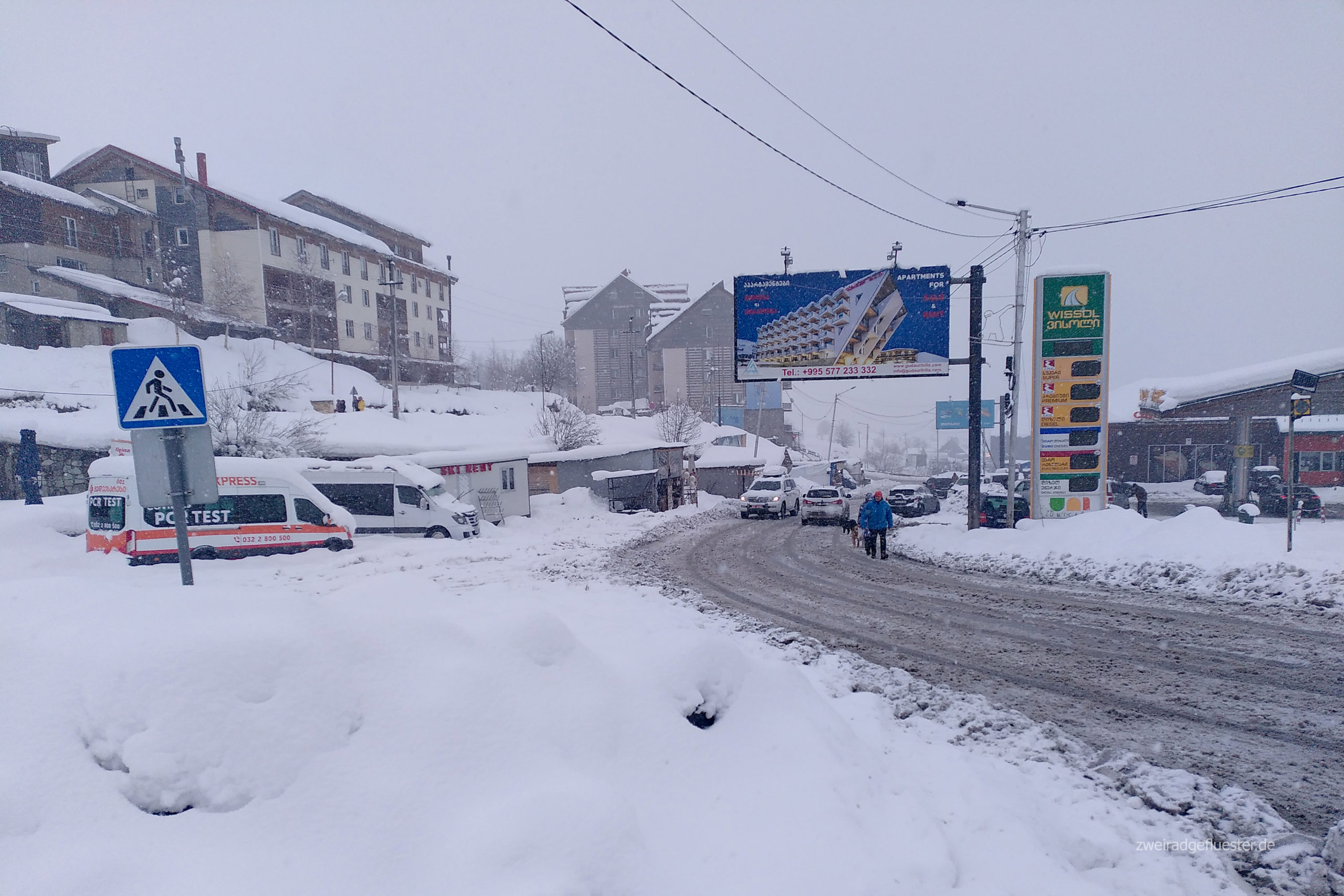 Um den langen, georgischen Winter zu überbrücken, entscheiden wir uns für den richtigen Winter, im Kaukasus, im Schnee! Nach Ewigkeiten wollen wir mal wieder in ein Skigebiet, in diesem Fall ist es das seit einem Youtube-Video weltbekannte Gudauri. Unsere Fahrräder können wir für eine kleine Gebühr bei Seo, unserer Vermieterin aus Batumi, im Büro abstellen. Mit dem Zug fahren wir von Batumi nach Tbilisi und kommen da ein paar Tage unter. Auf dem Flohmarkt und in günstigen Läden suchen wir uns Snowboardsachen, decken uns mit Lebensmitteln vom Markt für die nächsten Wochen ein und nehmen vollbepackt ein Bolt-Taxi in die weiten Berge des Kaukasus.