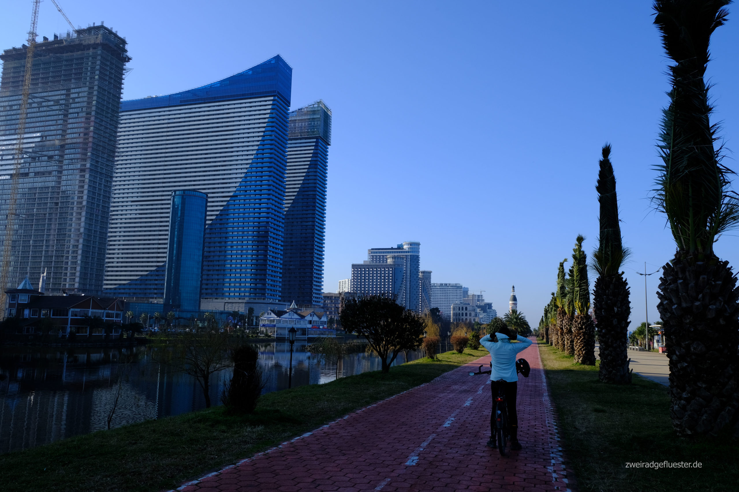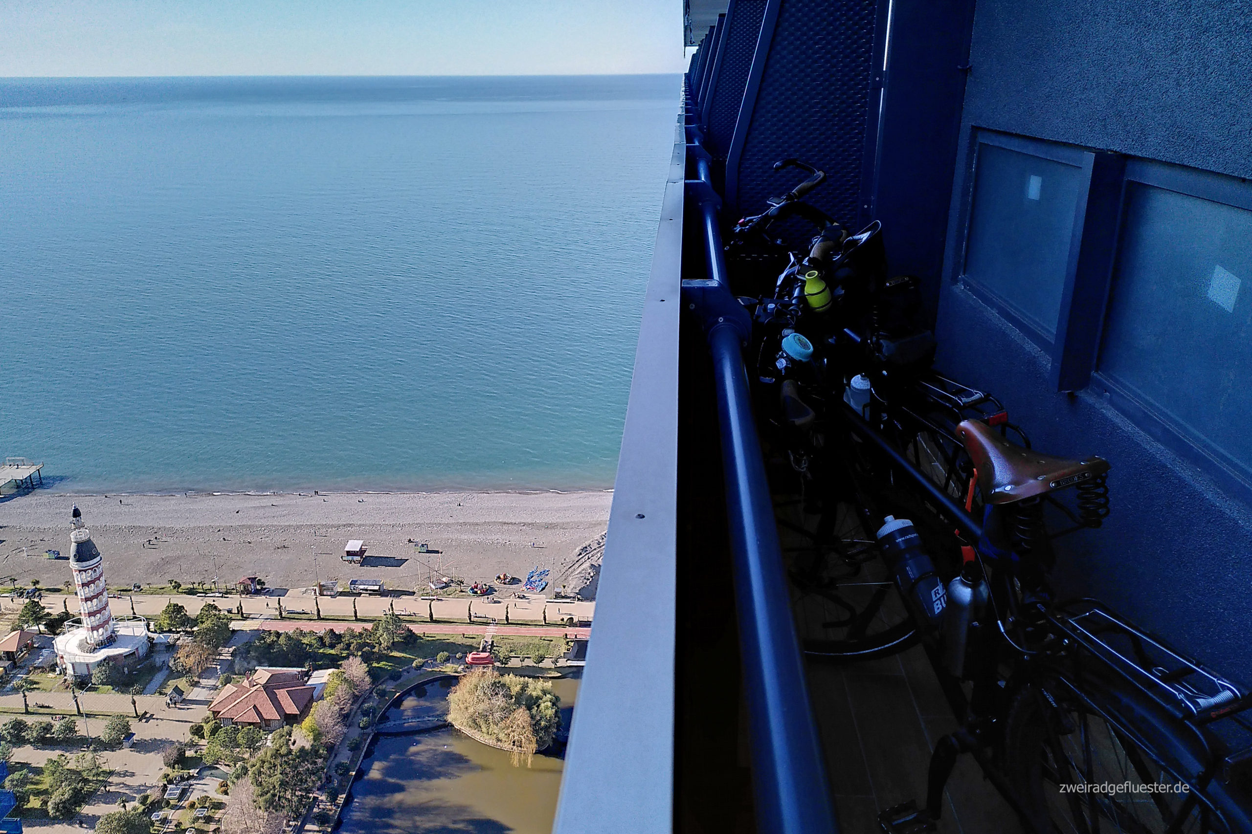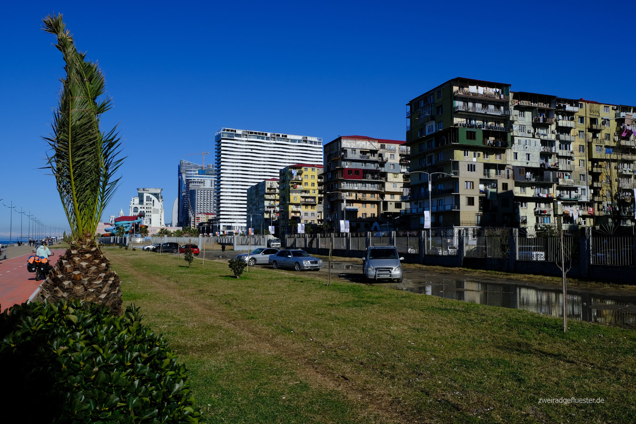 In Gonio scheint heute großer Waschtag zu sein. Überall baumelt die bunte Wäsche zwischen den Häusern auf den Leinen in der Sonne. Also beschließen auch wir gleich mal unsere Räder zu waschen, bevor es nach Batumi geht und biegen in eine Autowaschstation ein. Der Opi sagt uns, dass es noch kurz dauert und holt uns für die Wartezeit extra zwei Plastikstühle und einen Tisch aus der Garage. Kurze Zeit später kommt eine Frau um die Ecke und verköstigt uns noch mit türkischem Kaffee und Naschis. Sie spricht Englisch und übersetzt, dass der Opi es einfach nicht fassen kann, dass wir von Deutschland aus hier her geradelt sind. Er bietet uns gleich noch an bei sich im Haus zu pausieren und zu übernachten, aber leider haben wir schon eine Unterkunft in Batumi gebucht. Deshalb bedanken wir uns herzlich und rollen mit glänzenden Rädern wenig später auch schon auf dem Radweg am Meer in die Stadt.