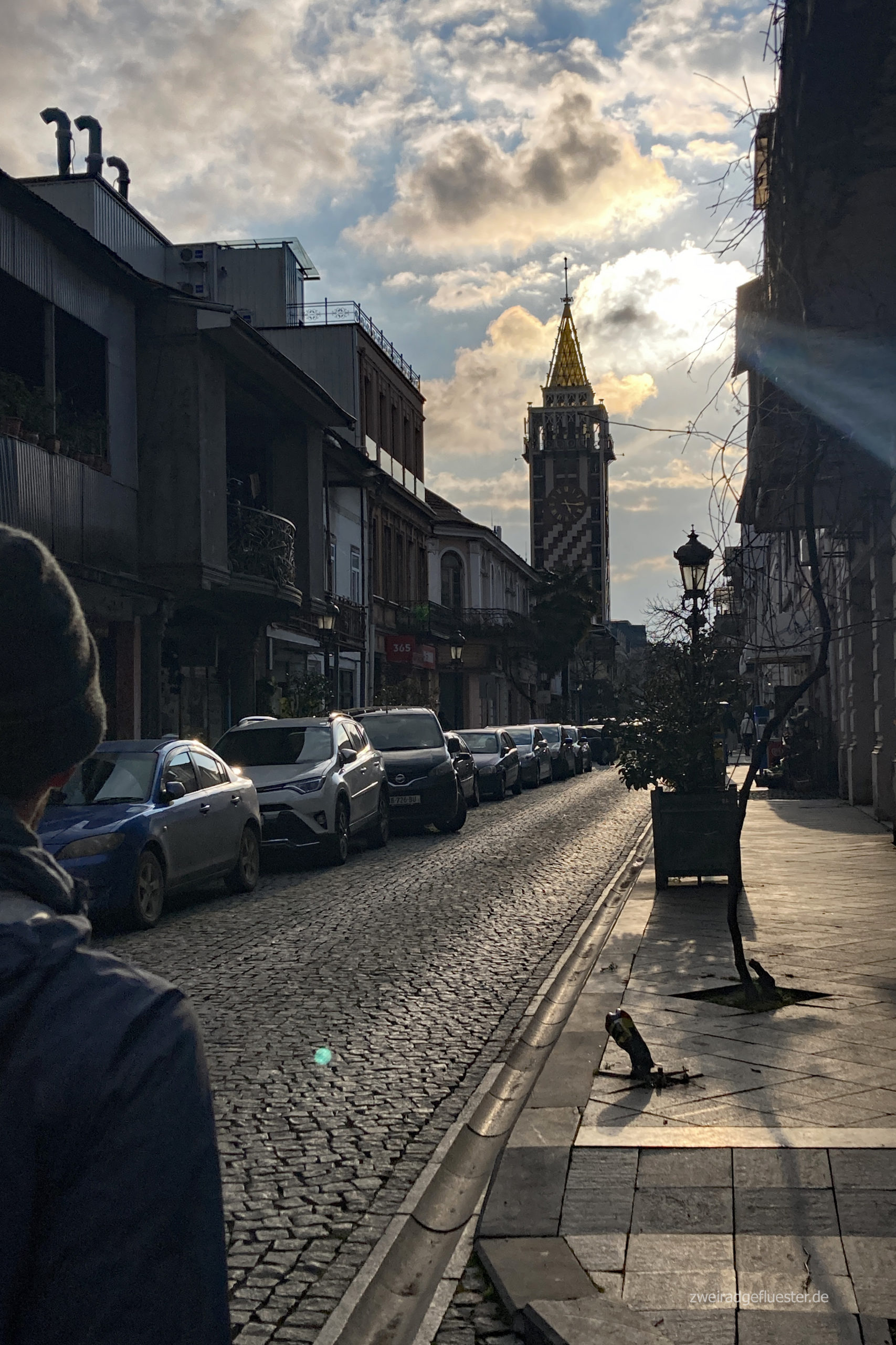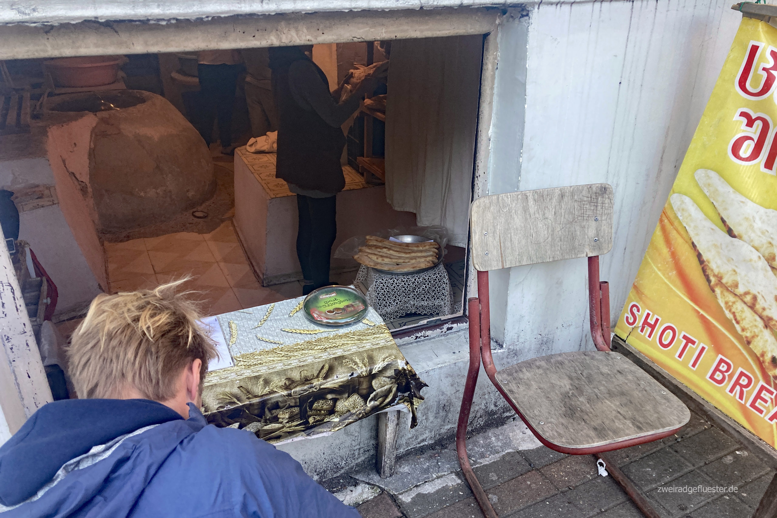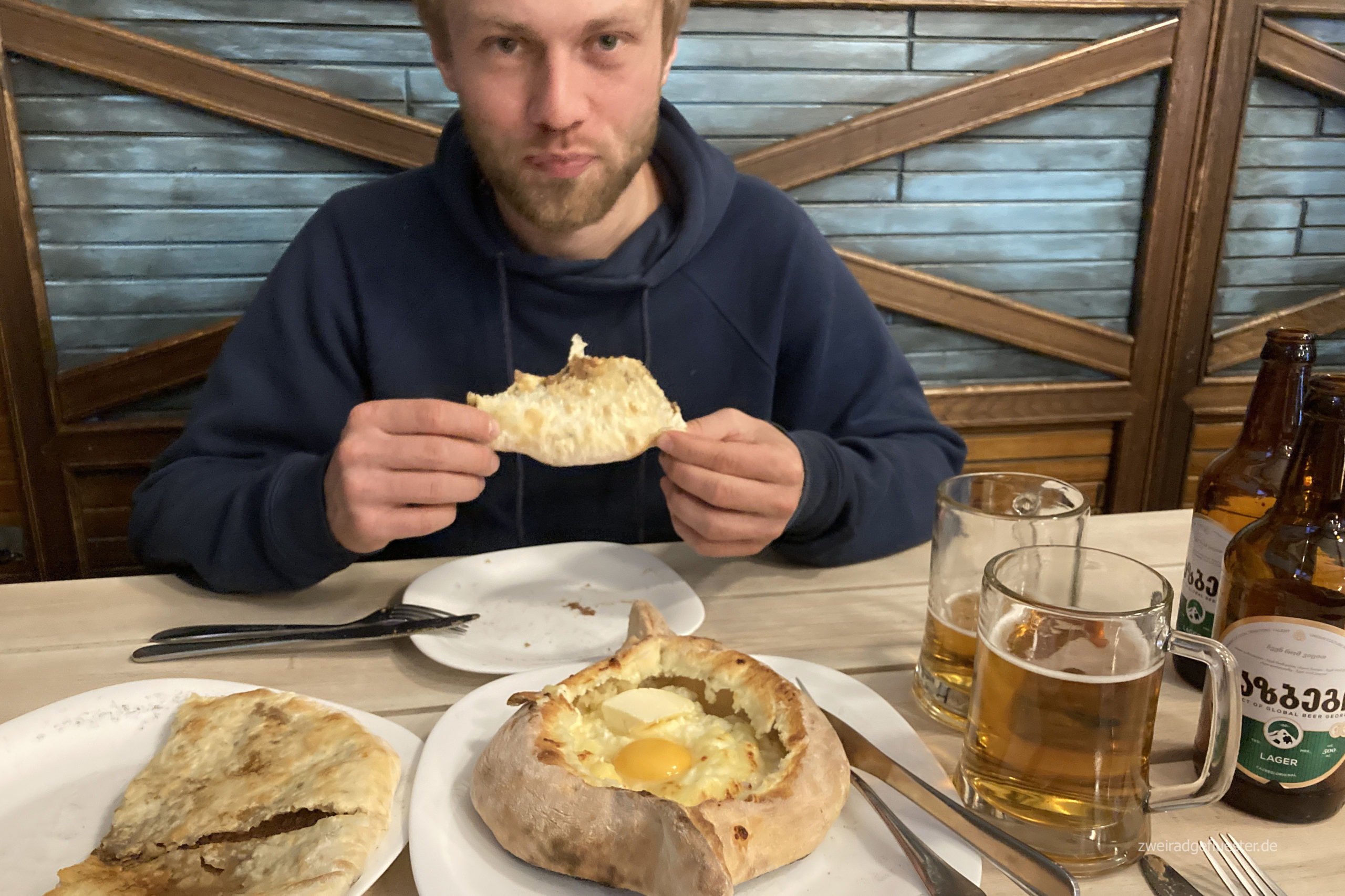 Nichtsdestotrotz laufen wir noch ein wenig weiter durch die Straßen und saugen die Atmosphäre auf. Wir schnabulieren ein georgisches Brot aus einem Fensterverkauf und probieren zum Abendbrot die ersten georgischen Leckereien. Wie man das Khachapuri richtig ist, versuchen wir am Nachbartisch rauszufinden. Bei einem georgischen Wein verdauen wir nun erstmal die ersten Eindrücke, den Landeswechsel und den Grenzkater.